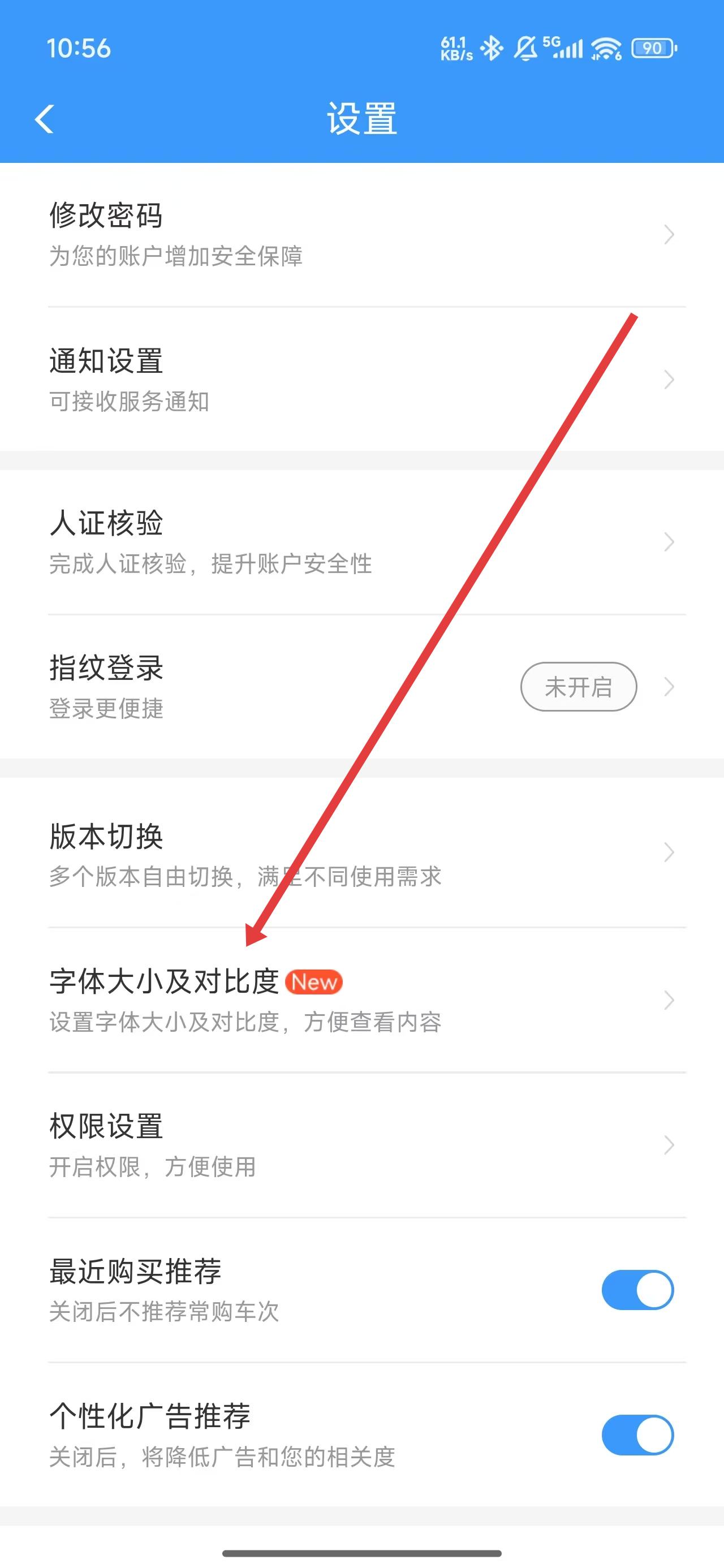 2、在进入到设置页面后,可以点击字体大小及对比度选项进入设置。