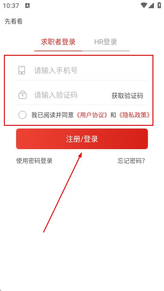 4、在求职者登录页面,输入手机号,输入验证码,勾选我已阅读并同意用户协议和隐私政策,点击注册/登录。