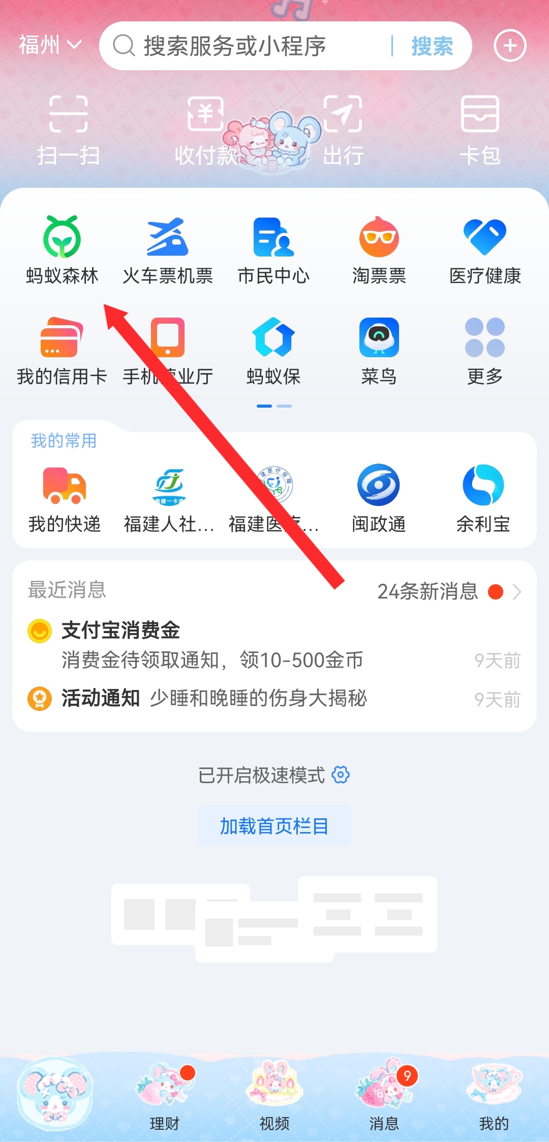 1、在支付宝的首页,需要点击蚂蚁森林,进入蚂蚁森林界面。