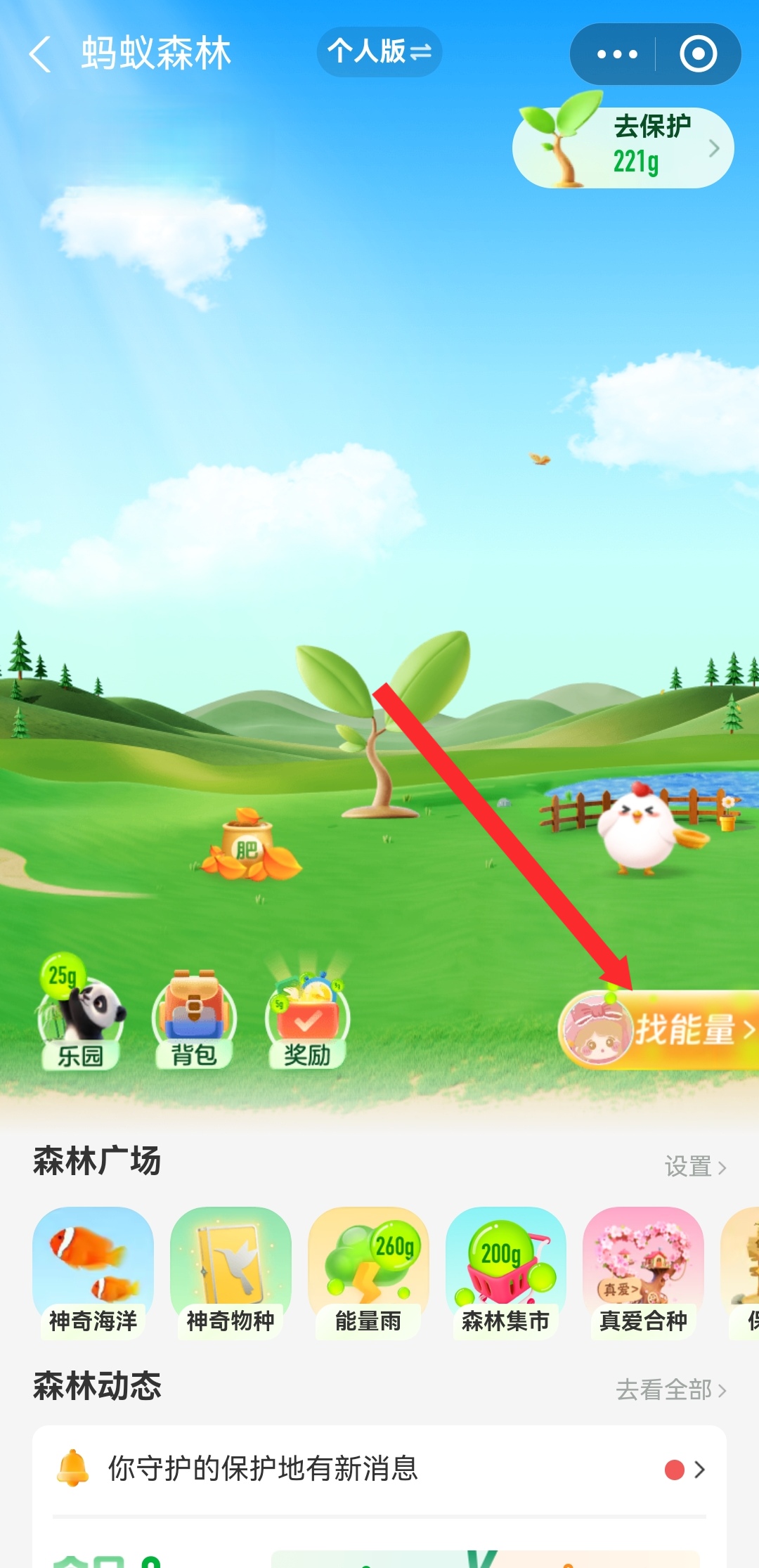 2、在蚂蚁森林界面,点击找能量按钮,进入好友的蚂蚁森林。