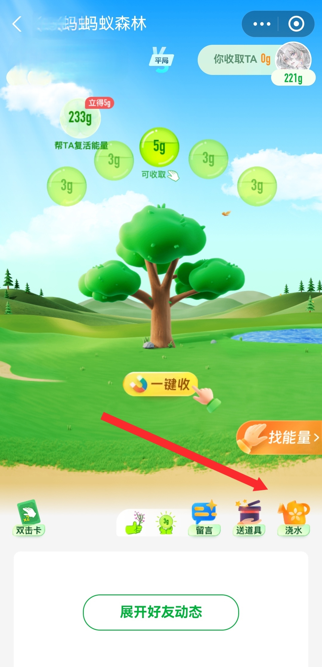 3、在好友的蚂蚁森林界面,点击浇水,进入浇水克数选择页面。
