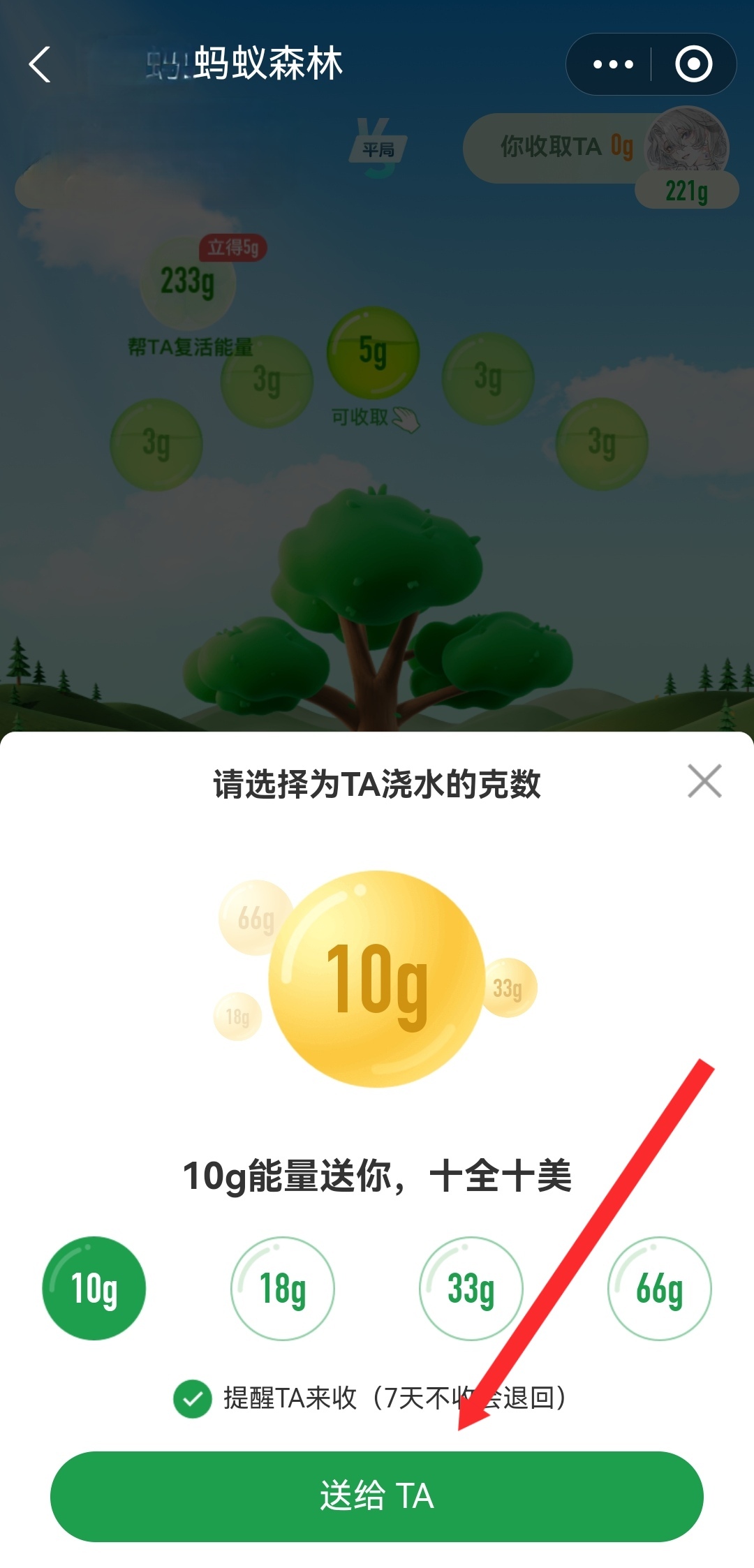 4、在选择页面,选择浇水克数后点击送给TA,完成给好友浇水操作。