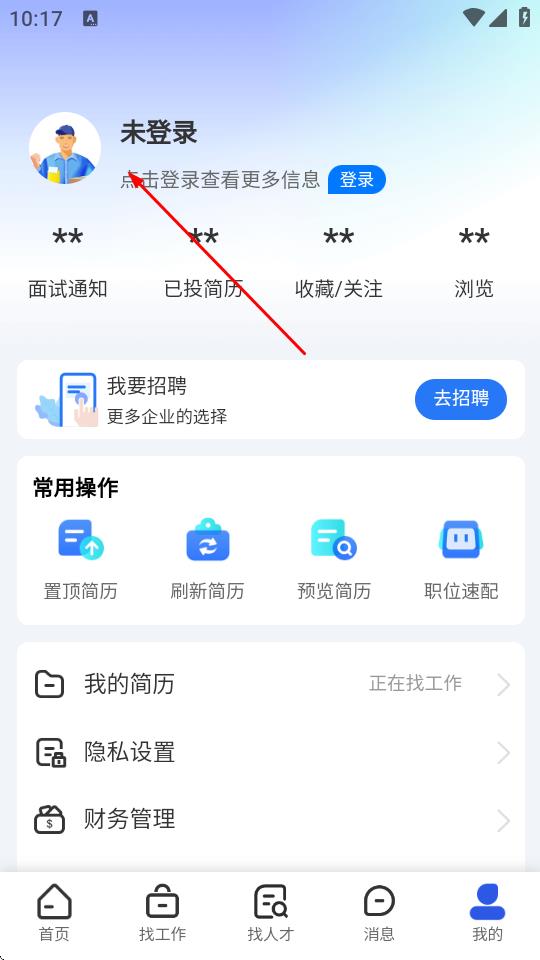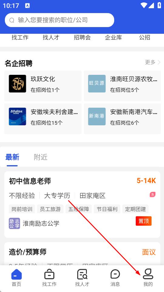 1、打开淮南人才网APP,点击底部导航栏中的我的。
