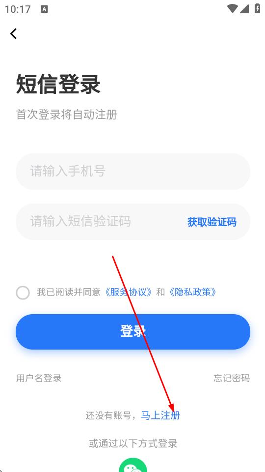3、在短信登录页面,点击下方还没有账号,马上注册选项。