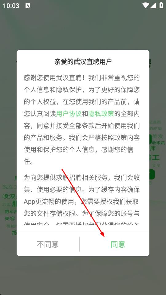 1、打开武汉直聘APP,在弹出的用户协议提示页面,点击同意。