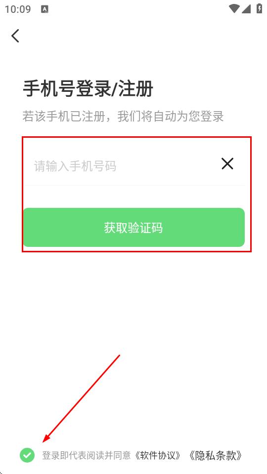 3、在手机号登录/注册页面,输入手机号码,勾选登录即代表阅读并同意软件协议隐私条款,点击获取验证码。