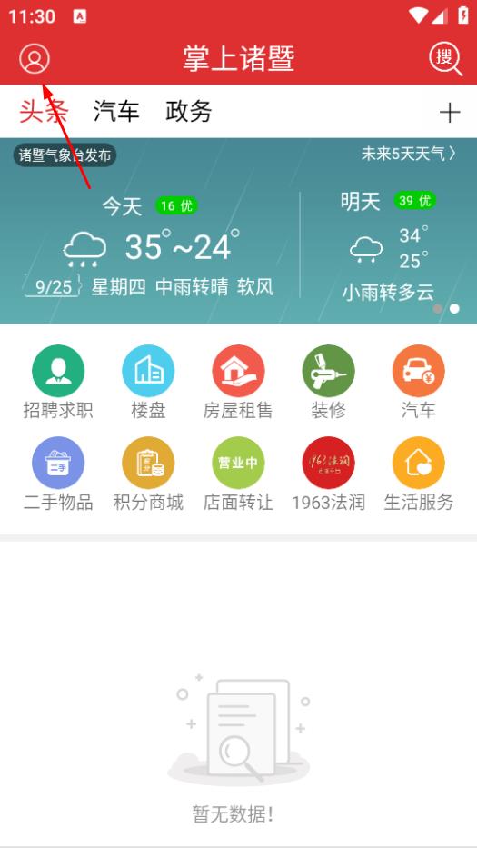 1、打开掌上诸暨,点击页面左上角的个人图标,进入我的页面。