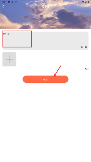 3、在写日记界面,输入日记内容例如你好呀,点击保存按钮。