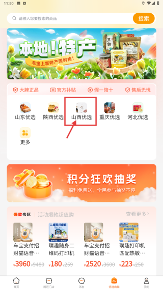 2、在优选商城页面,点击山西优选分类,浏览山西特产商品列表。