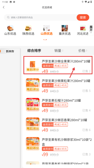 3、在山西优选分类中,找到目标商品芦荟圣果沙棘全果果汁,点击进入商品详情页。