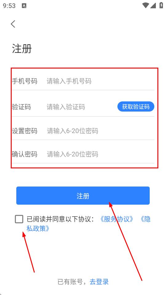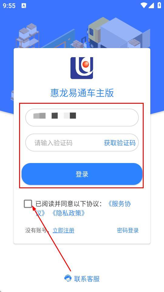 4、返回登录界面,输入手机号码,,输入收到的验证码,勾选已阅读并同意以下协议服务协议隐私政策,点击登录即可。