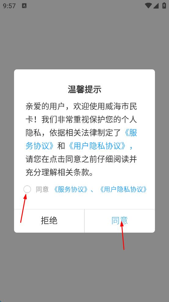 1、打开威海市民卡APP,出现温馨提示页面,仔细阅读后勾选同意服务协议,用户隐私协议,再点击“同意”按钮。