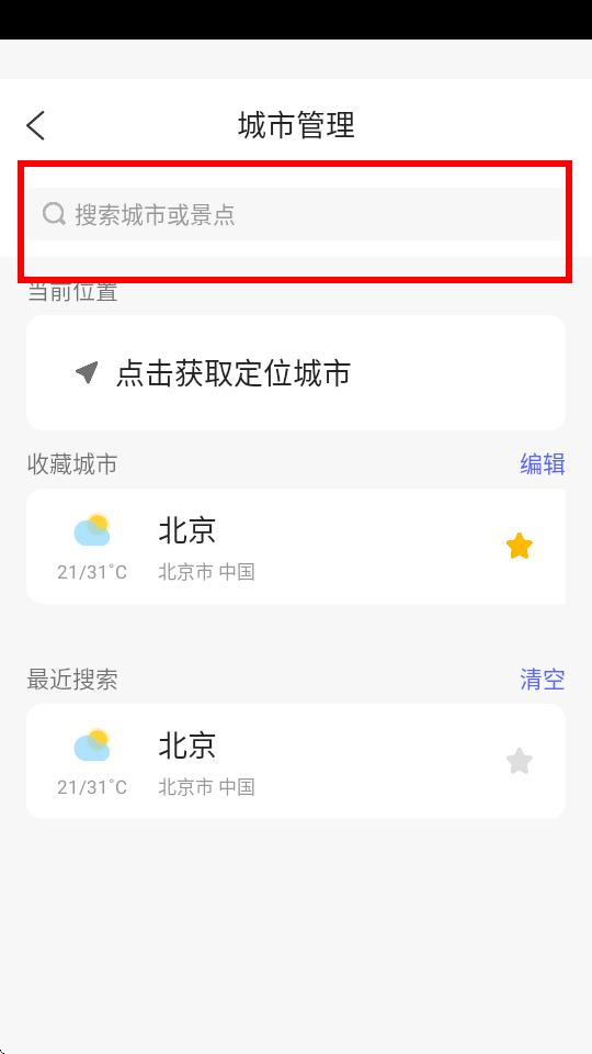 2、在城市管理页面的搜索城市或景点,搜索框中输入想要添加的城市名称。
