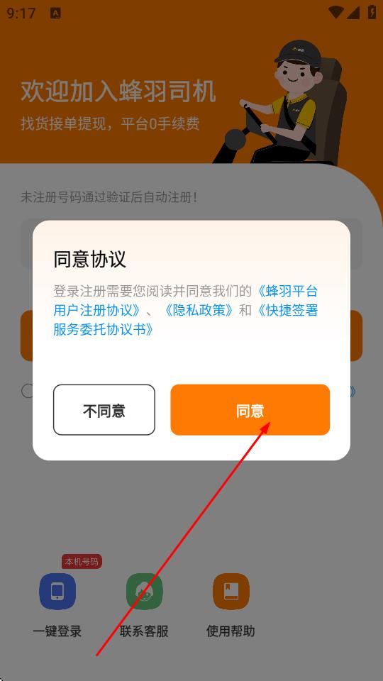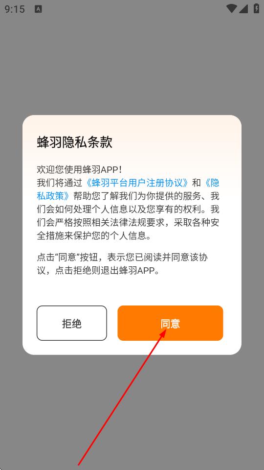 1、打开蜂羽APP,在弹出的蜂羽隐私条款页面,点击同意。