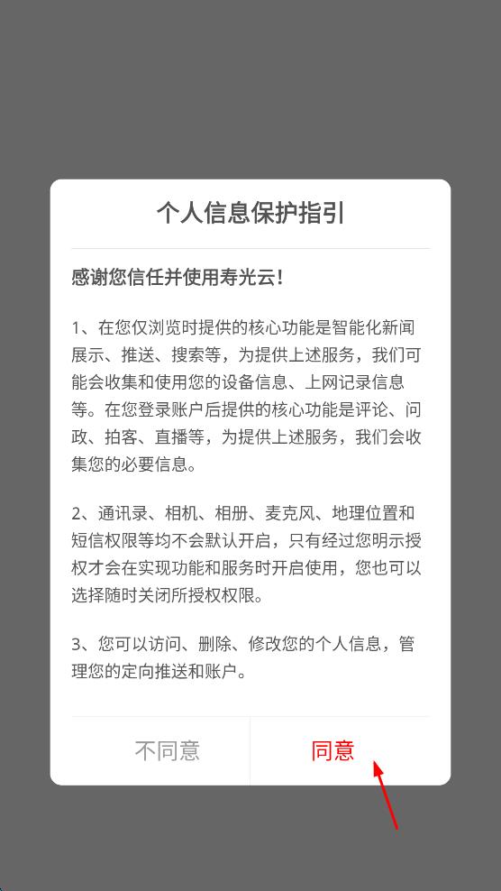 1、打开寿光云App,在个人信息保护指引页面,点击“同意”按钮。