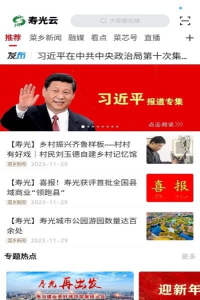 2.媒体板块,包含资讯推荐、早安寿光、直播、即时报、菜芯号五个模块。