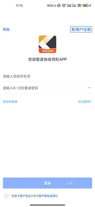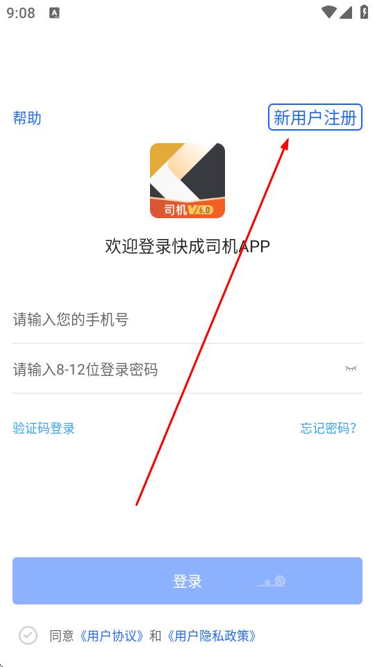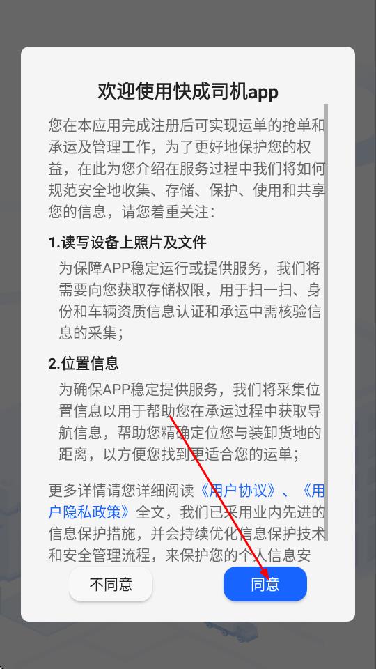 1、打开快成司机APP,在弹出的欢迎页面,阅读相关信息后,点击同意。