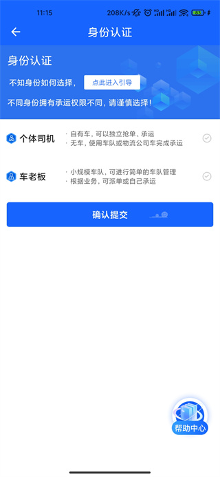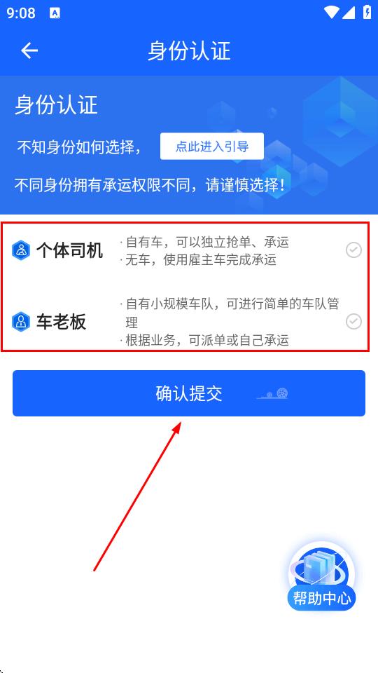 3、进入身份认证页面,选择个体司机或车老板身份,点击确认提交。