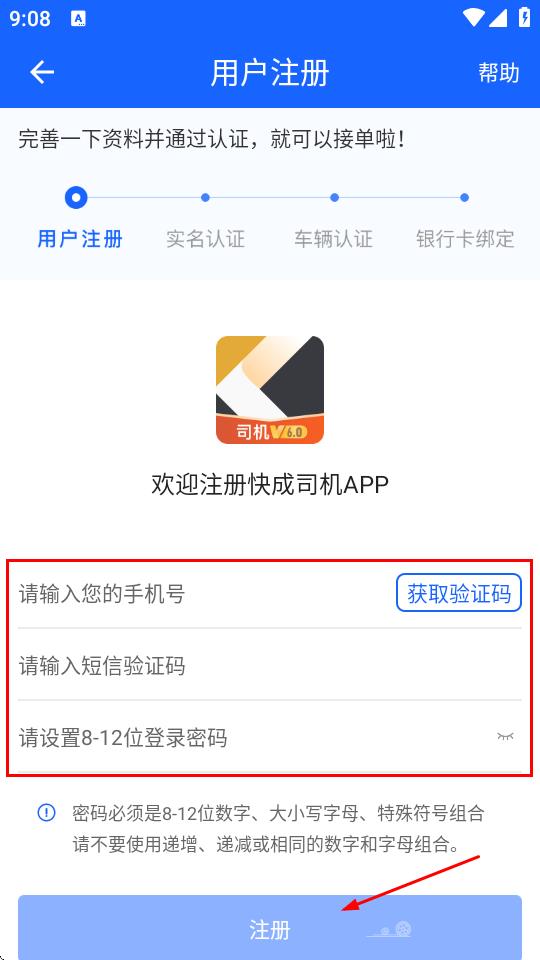 4、输入手机号、短信验证码和登录密码,即可完成注册。
