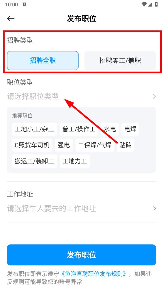 2、在发布职位页面,先选择招聘类型,比如招聘全职或招聘零工兼职。