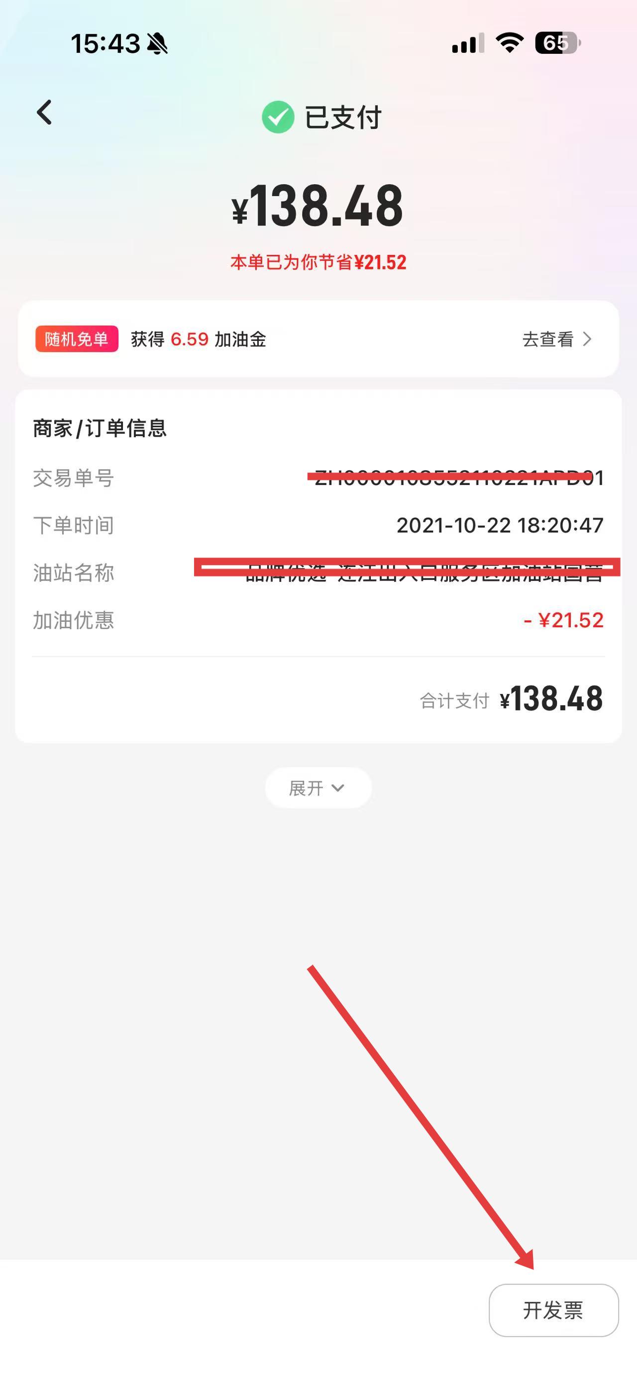 3、在订单界面找到需要开发票的加油订单,点击进入订单详情页。