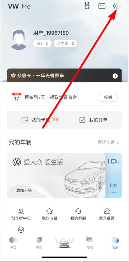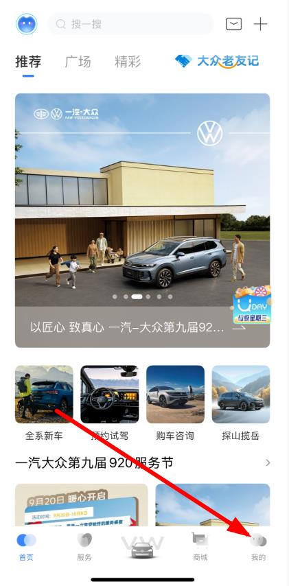 1、打开上汽大众app,点击底部导航栏中的我的进入个人页面。