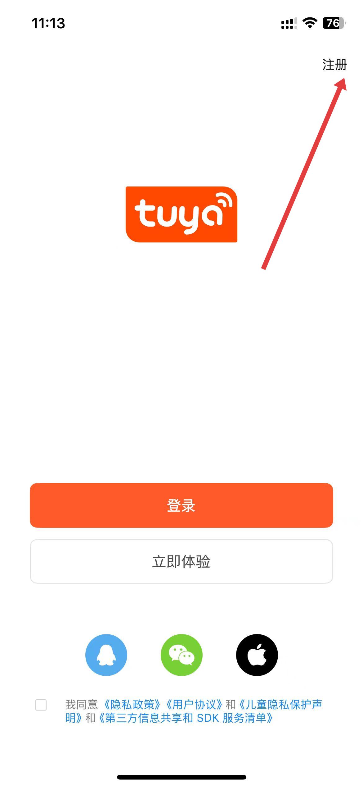1、打开涂鸦智能应用,在登录界面点击右上角注册。