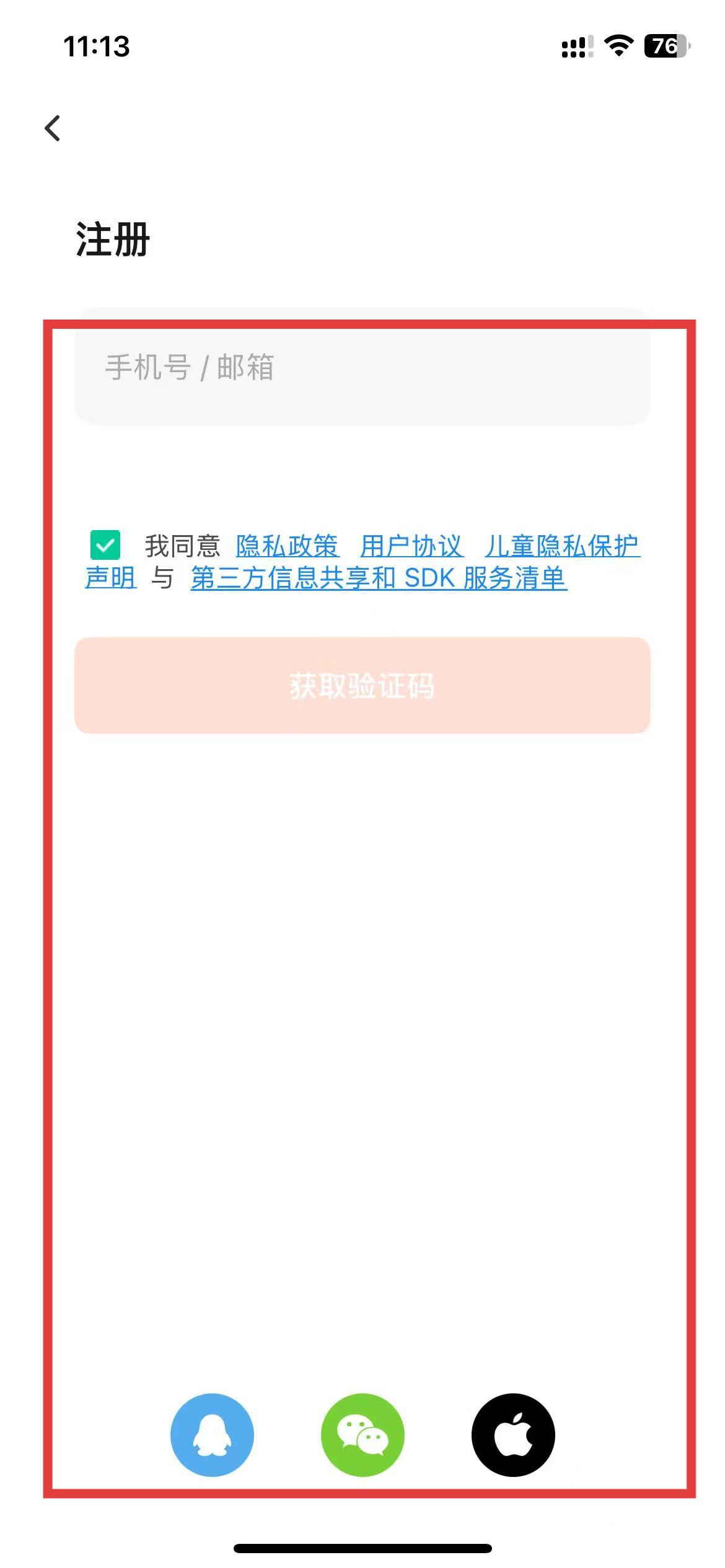 2、在注册页面输入手机号或邮箱,勾选相关协议选项。