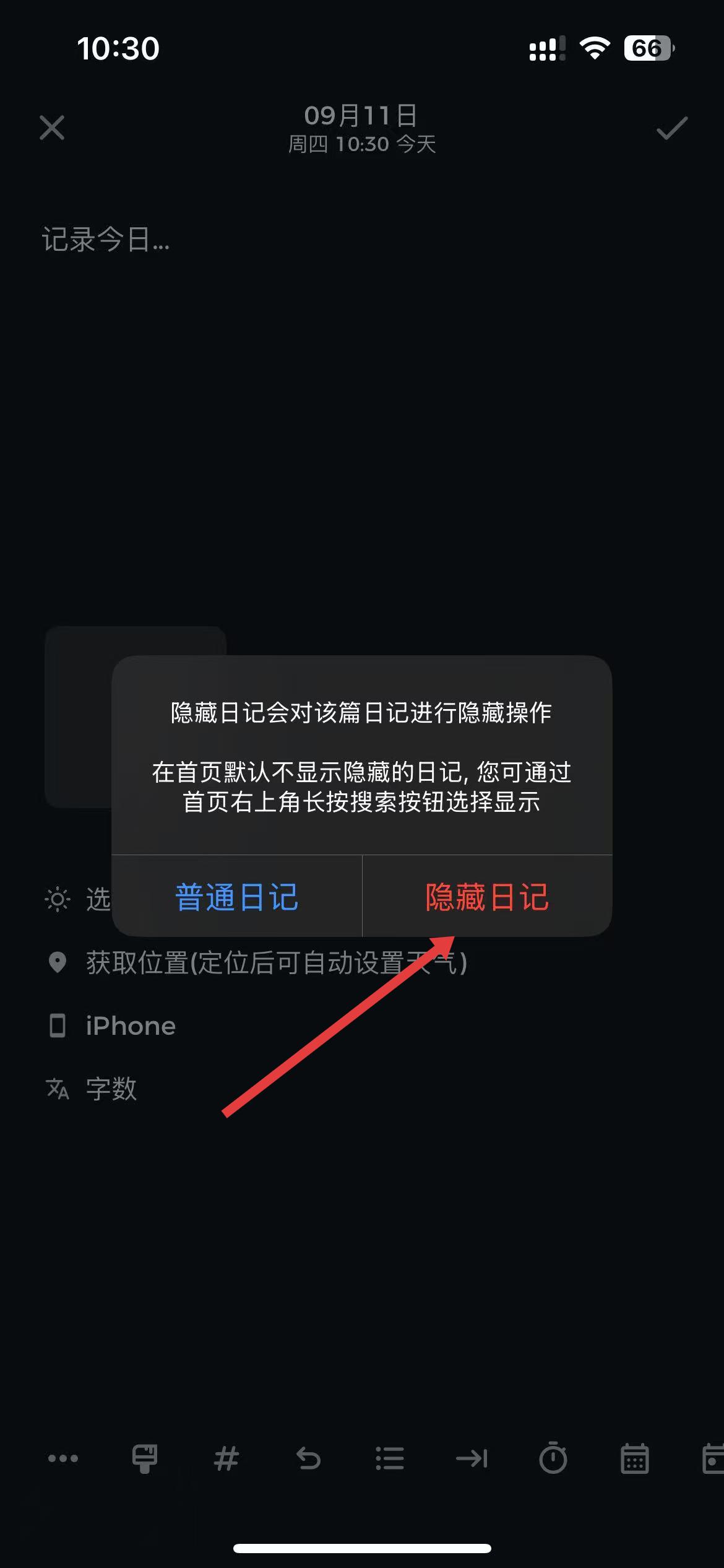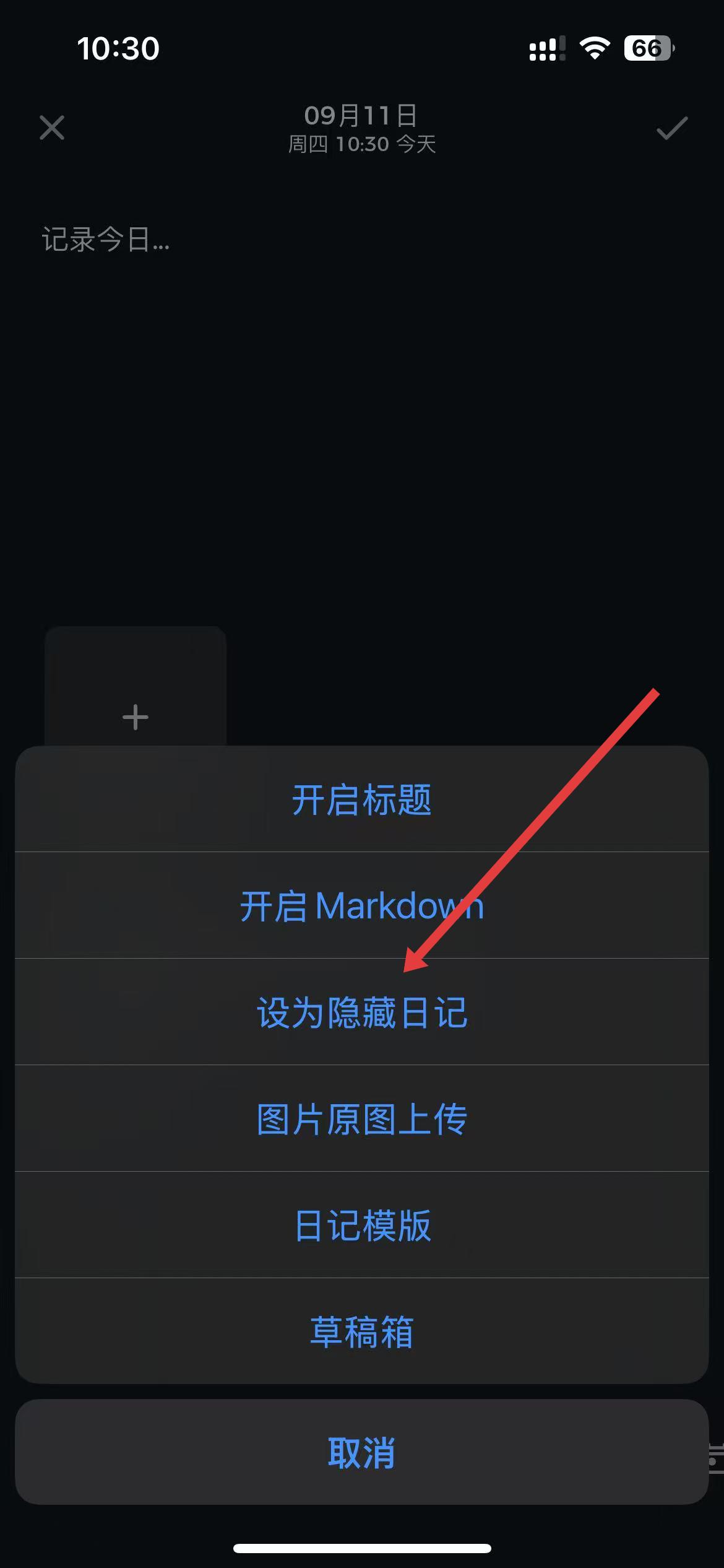 3、在弹出的更多操作菜单中,点击设为隐藏日记选项。