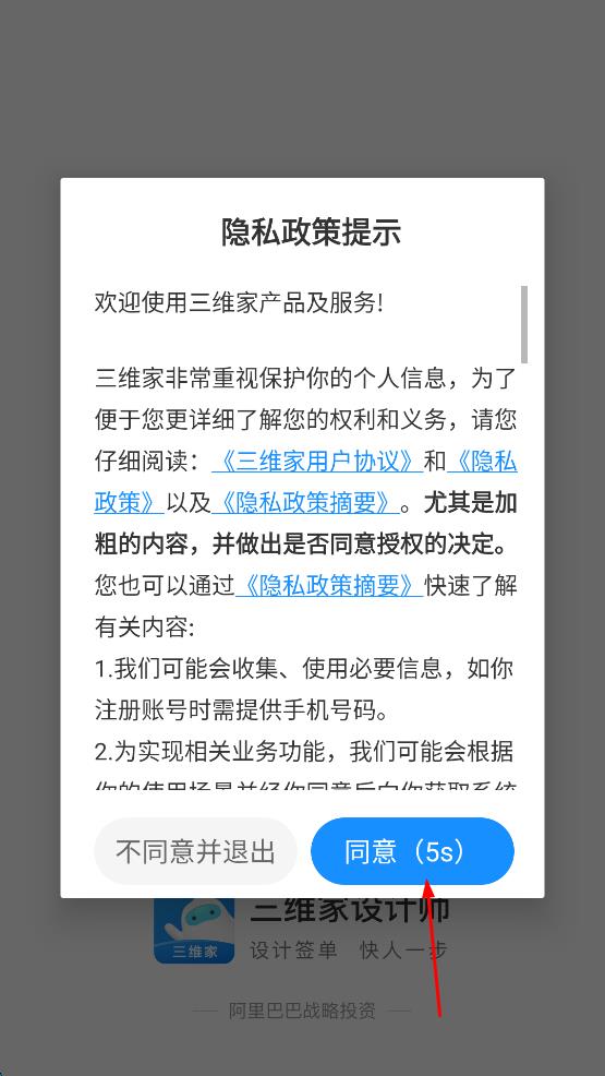1、打开三维家App,出现隐私政策提示弹窗,等待倒计时结束后点击同意按钮。