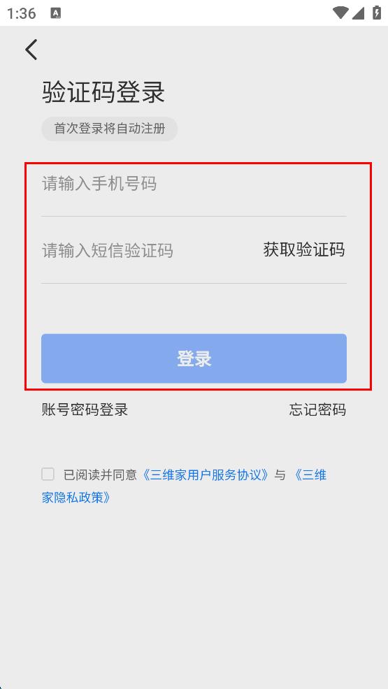 4、在验证码登录页面输入手机号码,点击获取验证码,收到后输入验证码,勾选已阅读并同意相关协议,点击登录按钮完成登录。