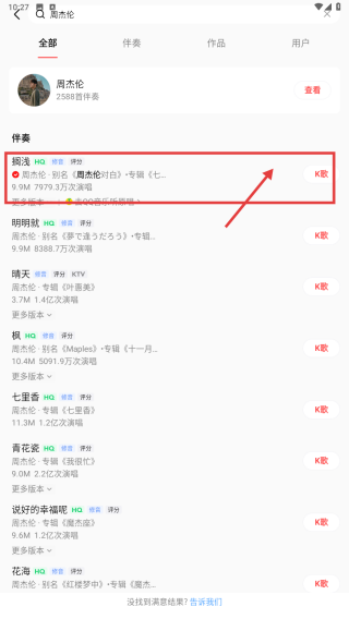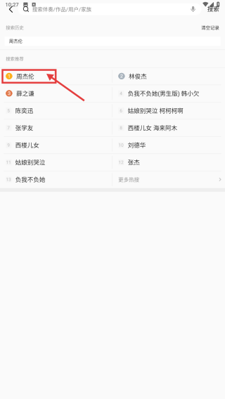 2、在搜索页面,点击周杰伦选项,进入周杰伦相关内容列表。