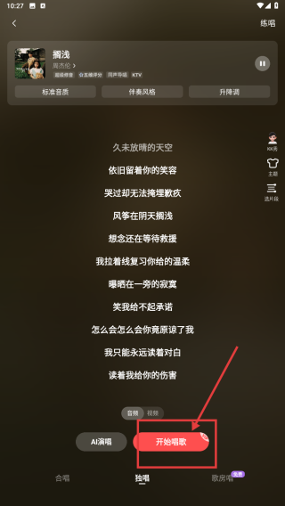 4、在播放页面,点击开始唱歌按钮,开始演唱搁浅。