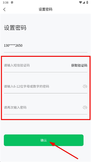 5、在界面点击获取验证码,将接收到的短信验证码填入,设置密码并再次确认密码,最后点击确认完成登录密码设置。