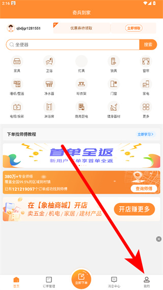 1、打开奇兵到家APP,点击底部导航栏最右侧我的进入个人页面。