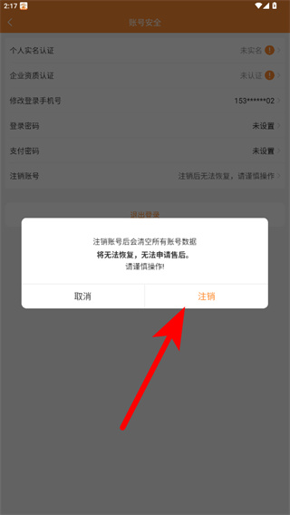 4、在弹出的确认提示框中,点击注销,按提示完成后续操作即可成功注销账号。