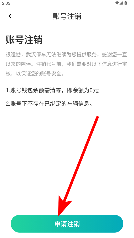 4、阅读账号注销条件,确认账号钱包余额为0元且无已绑定车辆信息后,点击申请注销按钮,完成账号注销操作。