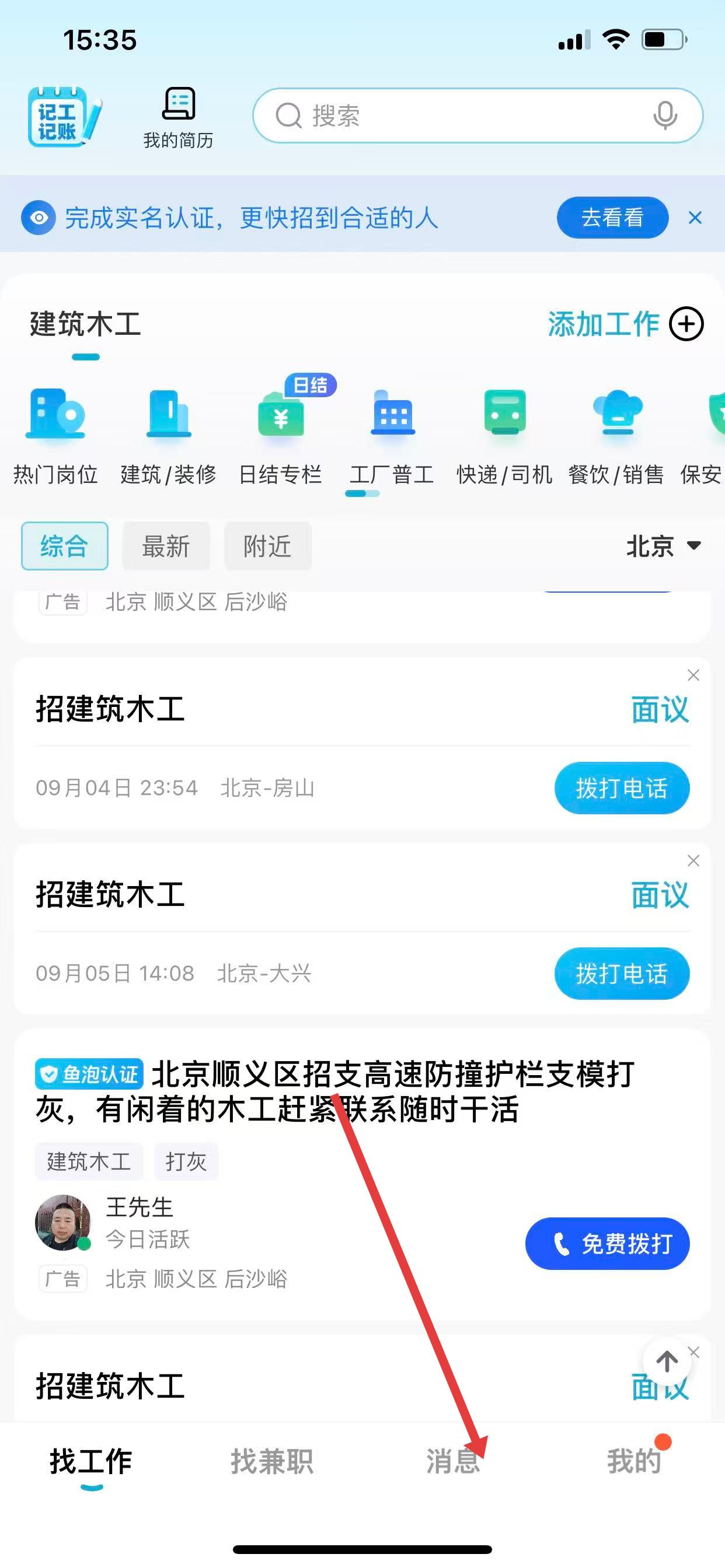 1、打开吉工家App,点击底部导航栏中的消息选项。