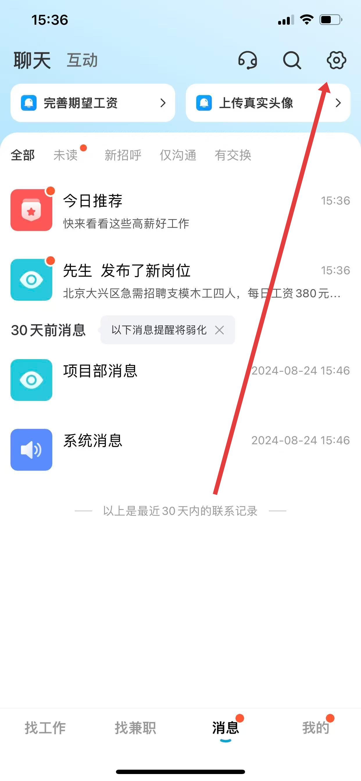 2、在消息页面,点击右上角的设置图标。