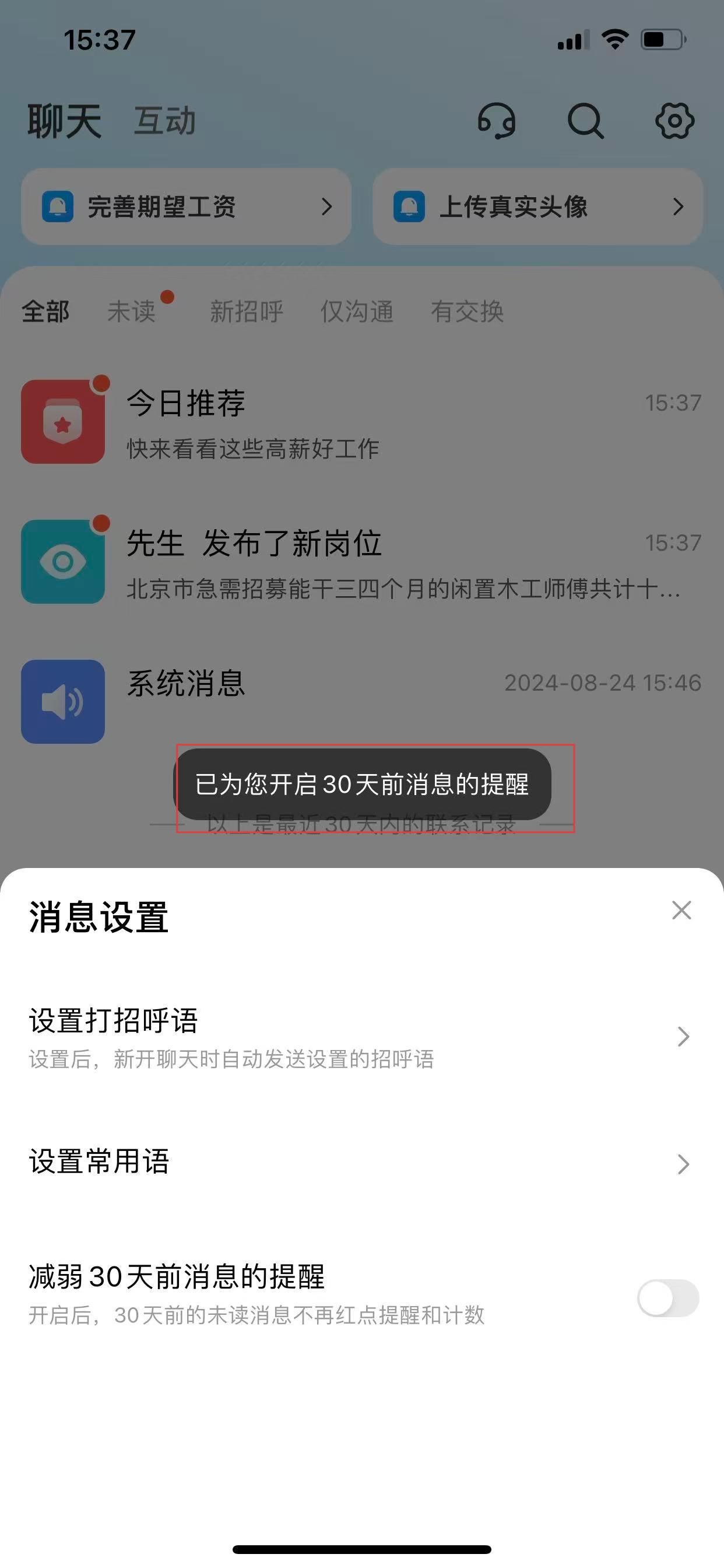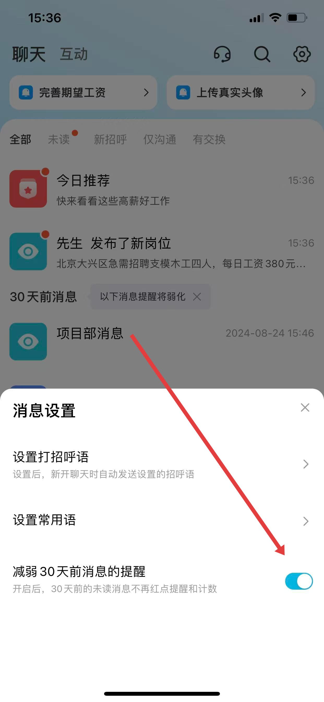 3、找到减弱30天前消息的提醒选项,点击该选项右侧的开关按钮进行设置。