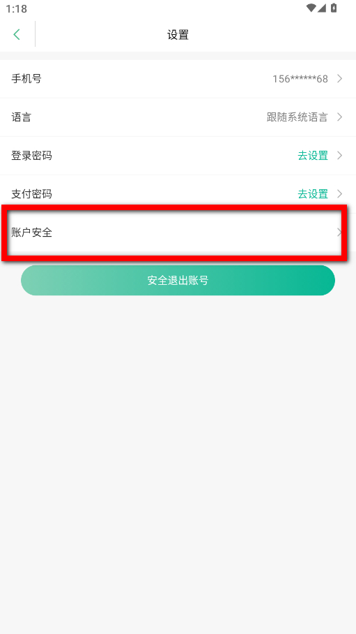 3、在设置页面里,点击账户安全选项,进入账户安全设置界面。
