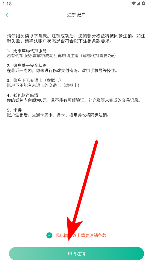 5、阅读并确认符合注销条款后,勾选相关选项,点击申请注销完成账号注销。
