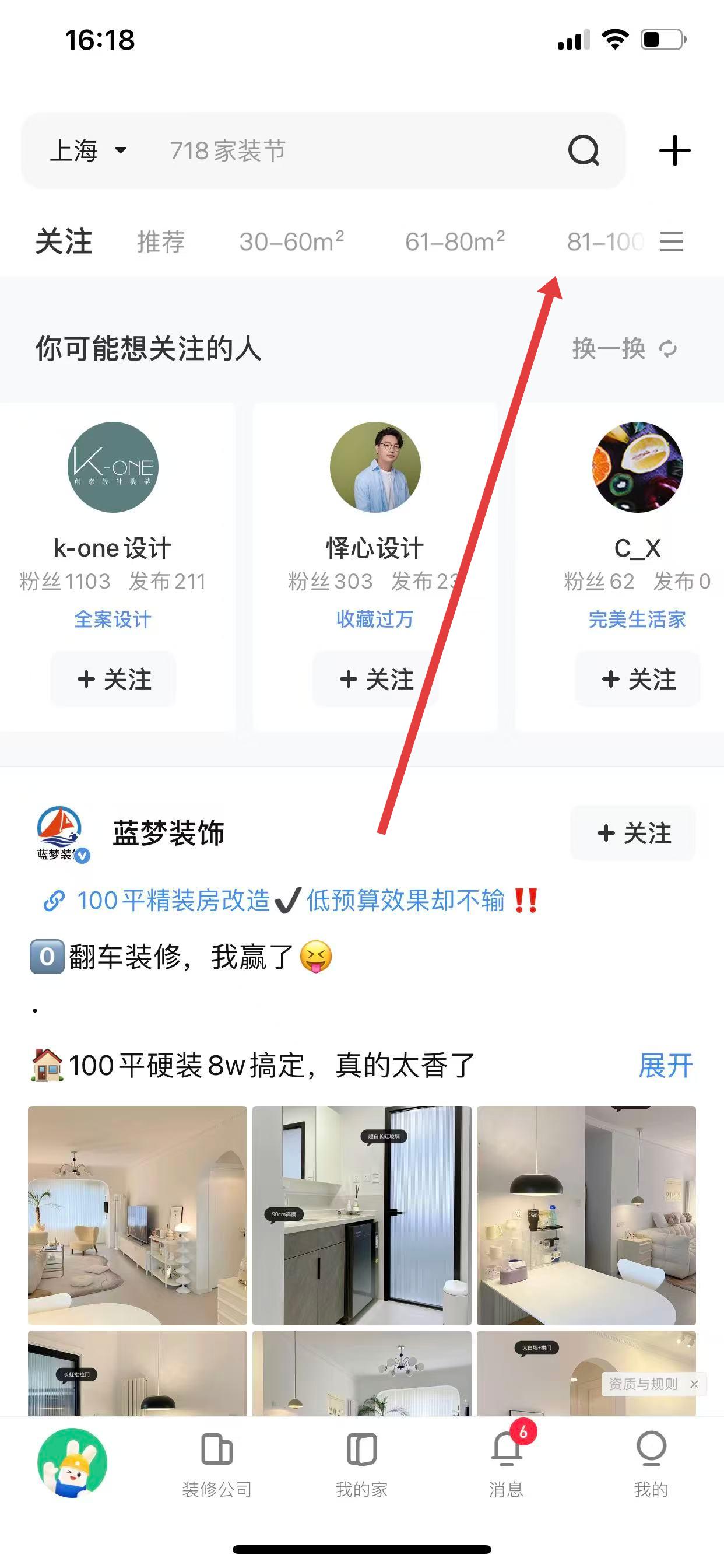 1、打开土巴兔装修App,在首页上方可看到筛选面积的选项,点击该选项。