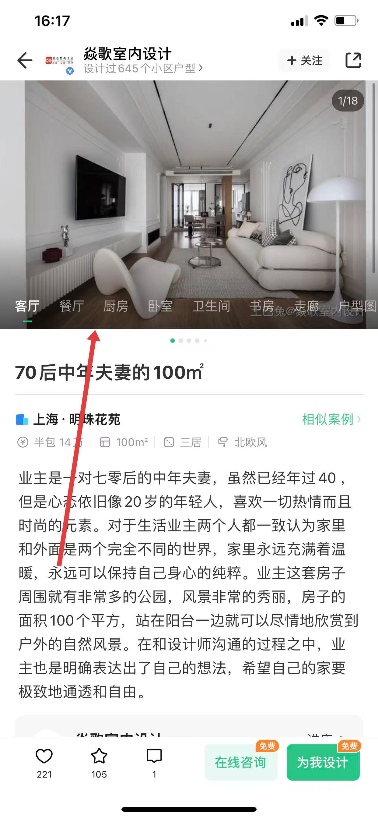 2、在推荐的装修案例列表里,找到感兴趣的案例图片,点击进入其详情页面。