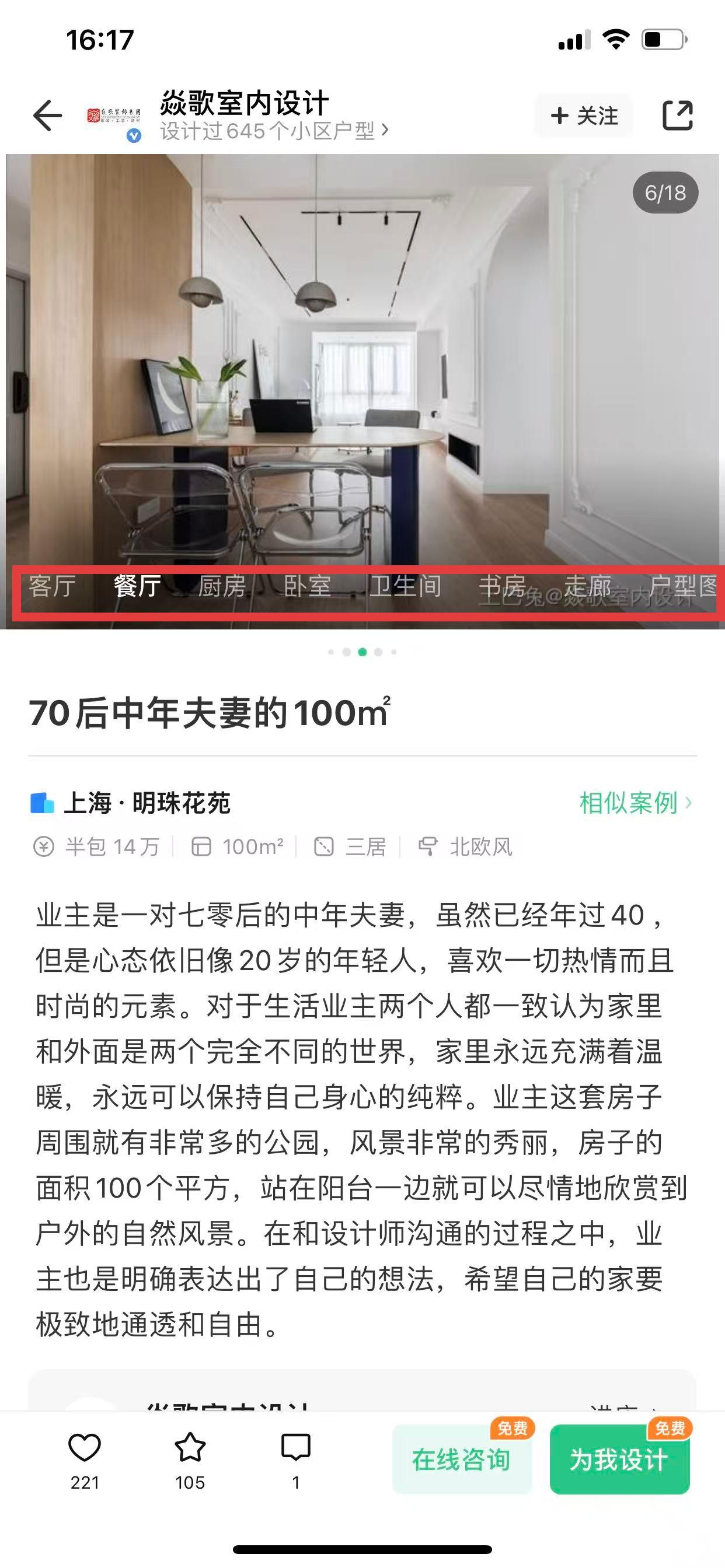 3、进入装修案例详情页后,能看到该案例的整体效果图,点击餐厅标签。