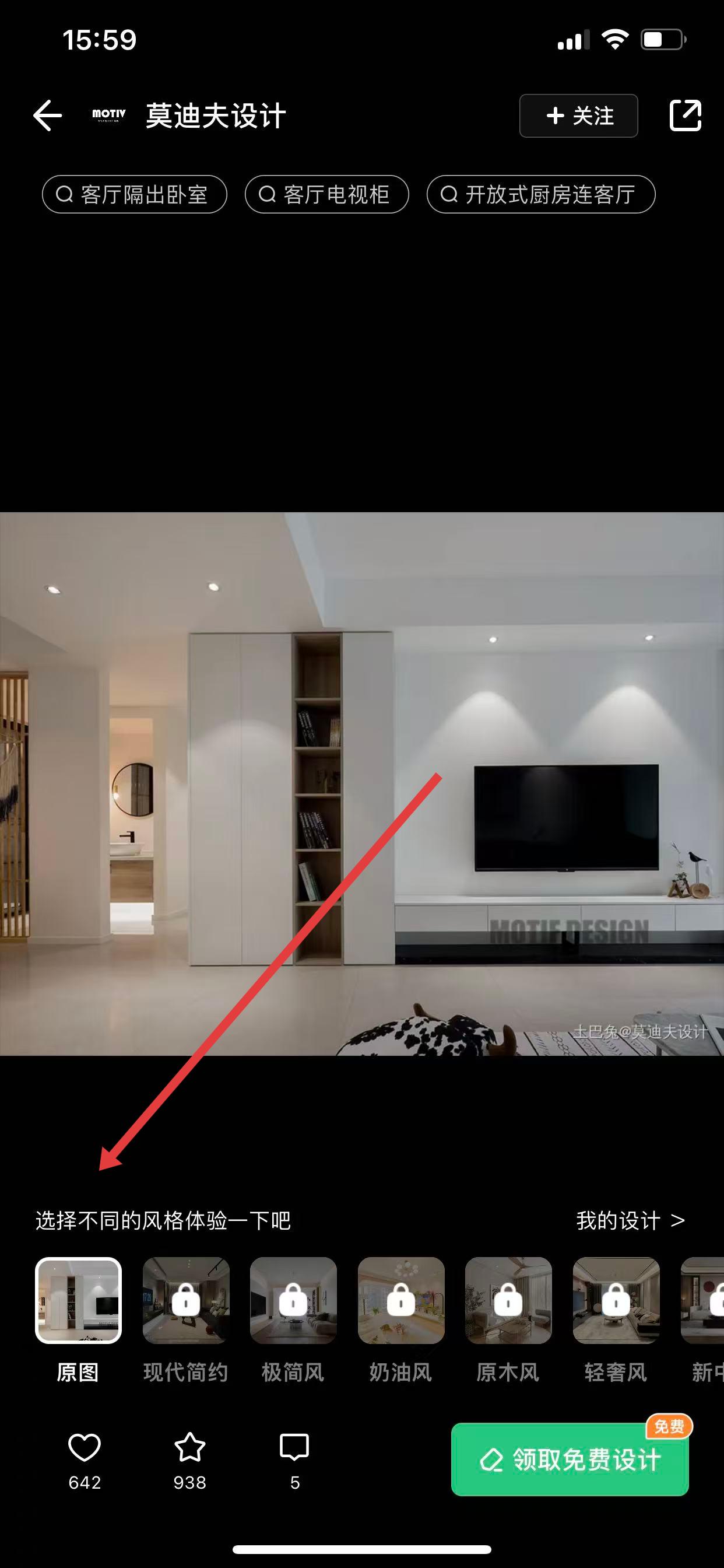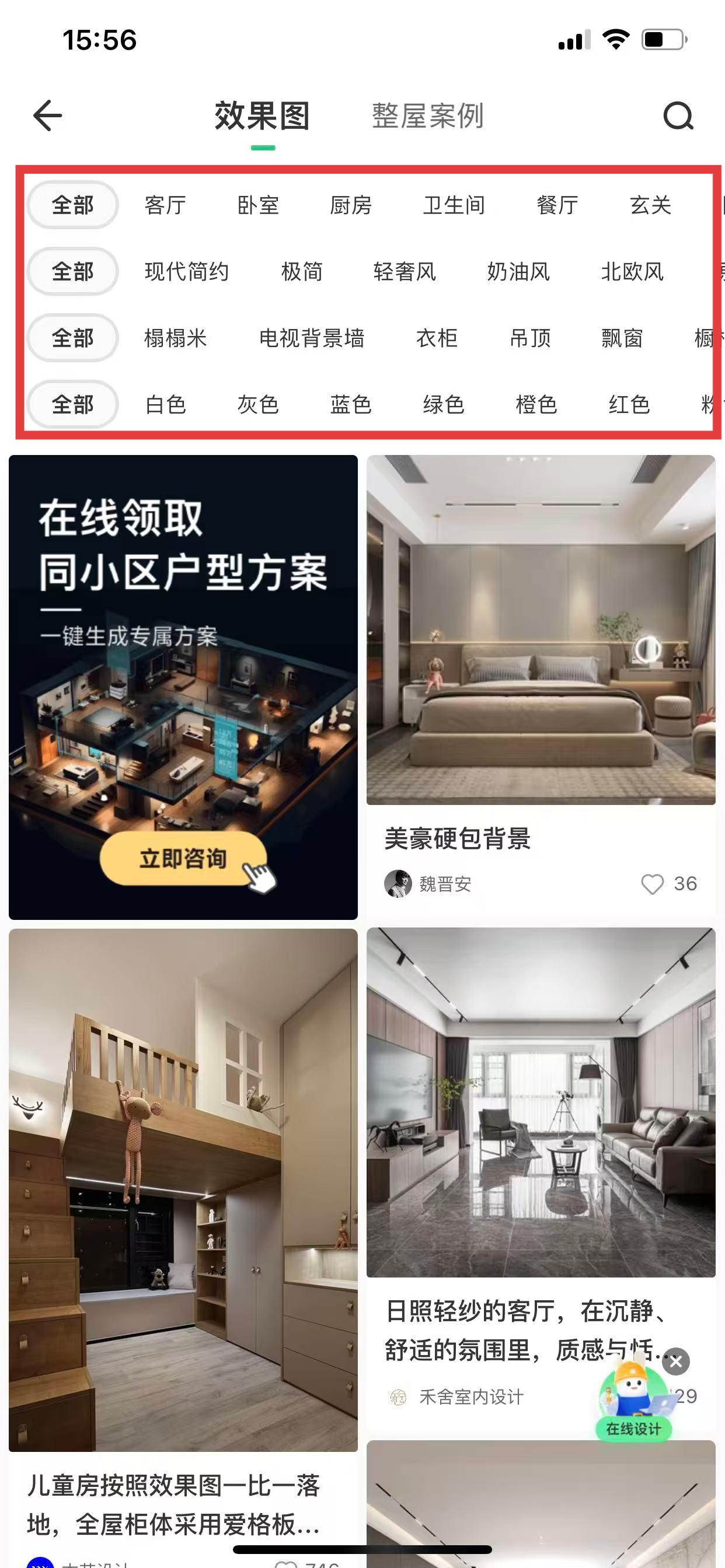 2、有按照空间、风格、元素、颜色分类的标签,根据需求点击相应标签。