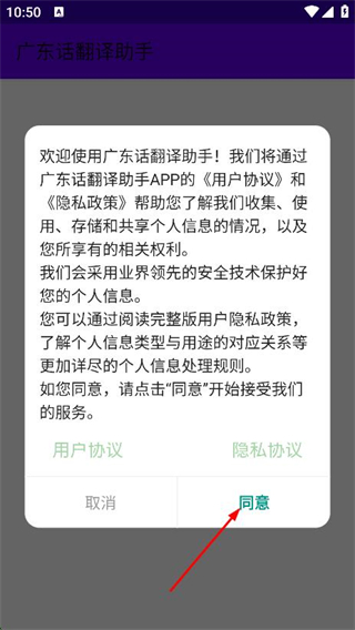 1、在广东话翻译助手协议弹窗中,点击同意,进入广东话学习工具箱页面。