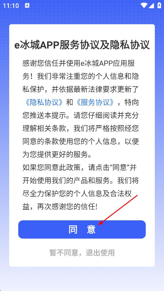 1、打开e冰城,在弹出的服务协议及隐私协议页面,点击同意,进入e冰城首页。