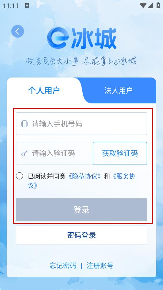 4、在登录选择界面,选择个人用户,输入手机号码,获取并输入验证码,勾选已阅读并同意相关协议,点击登录即可。