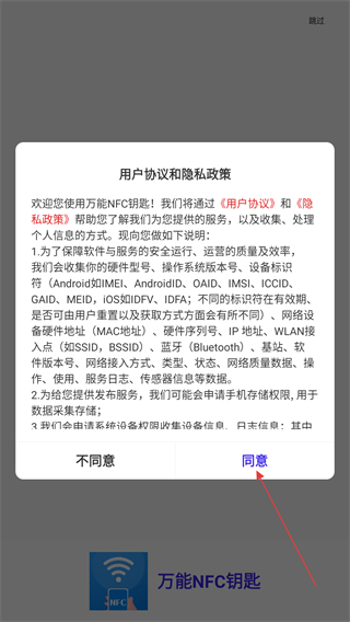 1、打开万能NFC钥匙APP,进入时会弹出用户协议和隐私政策,点击同意的按钮。